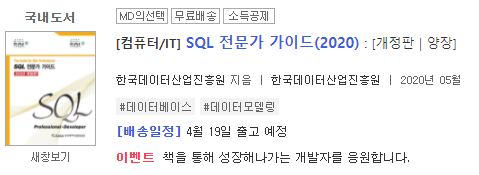 기본 교재는 SQL 전문가 가이드로 정했다. 이론적인 부분이 상세히 기술되어 있고, 구글링을 통해 PDF파일도 쉽게 구할 수 있다. 단점이라고 하면 PDF파일을 제본을 떠서 공부하니 두께가 상당했고, 가독성이 좋지 않았던(특히 쿼리문) 점을 꼽을 수 있겠다.