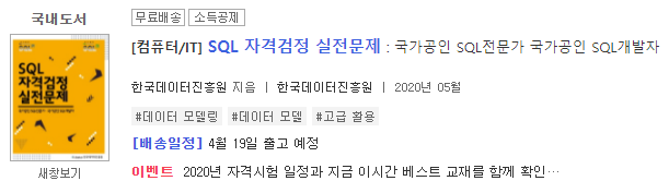 다른 블로그에는 이 책을 2~3회독은 해야한다고 하시는 분들이 계셨는데, 본인이 정말 SQL를 깊이 공부하고자 하는 목표를 세웠다면 그렇게 하는 것을 추천한다. 하지만, 일단은 짧은 시간 내에 시험에 합격하는 것이 목표라면 아래의 SQL 자격검정 실전문제를 풀면서 잘 이해가 안되거나 까먹은 부분만 다시 보는 것을 강력하게 추천한다.