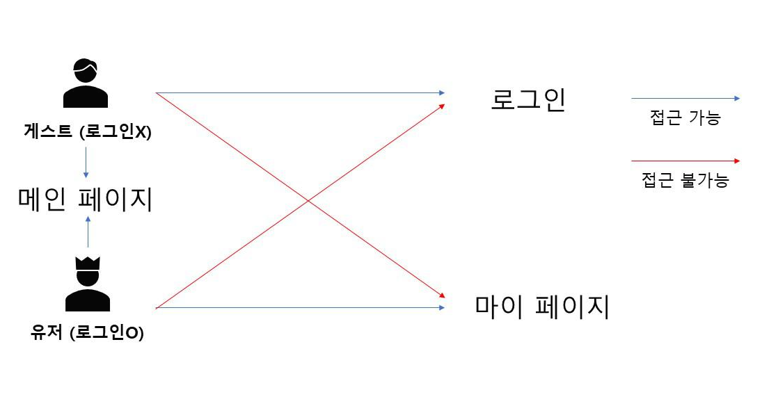 사용자의 로그인 상태나 권한에 따라 접근할 수 있는 경로가 다르다. 물론 서버쪽에서 체크를 해주긴 하지만, 해당 URL로 넘어간다는 것 자체를 프론트측에서 막아주는 것이 바람직하다. 이를 그림으로 표현하면 다음과 같다.