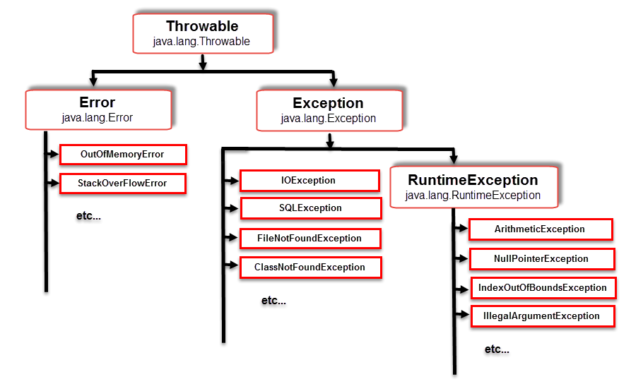 프로그램이 실행 중 어떤 원인에 의해 오작동을 하거나 비정상적으로 종료되는 경우가 있는데, 이러한 결과를 초래하는 원인을 프로그램 에러 또는 오류라고 한다. 자바에서는 실행 시 발생할 수 있는 프로그램 오류를 에러(error)와 예외(exception) 두 가지로 구분한다.