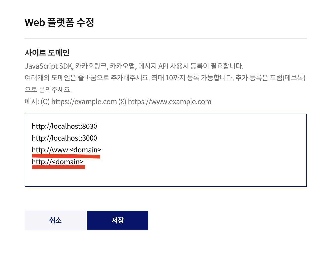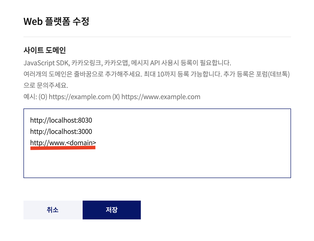 문제의 원인은 금방 찾을 수 있었다. 결론만 말하자면, 카카오 개발자 센터에서 사이트 도메인에 제대로 도메인을 등록하지 않은 것이 문제였다.