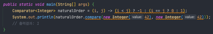 Comparator<Integer> naturalOrder = (i, j) -> (i < j) ? -1 : (i == j ? 0 : 1);