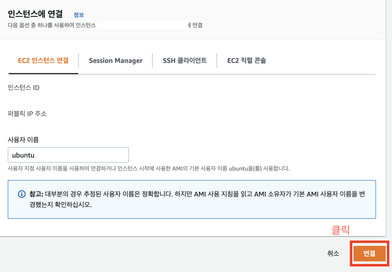 3) EC2 인스턴스 연결 > 연결