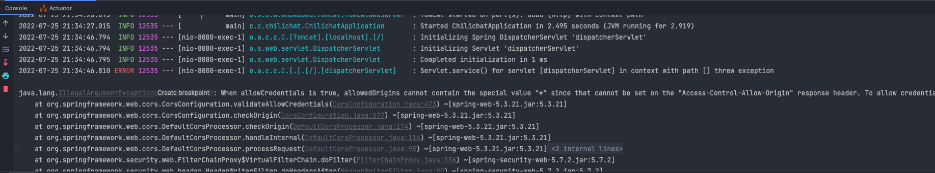 CORS 필터를 분명 적용했는데, CORS에러가 발생해서 디버깅을 해봤더니 다음과 같은 에러가 발생했다.