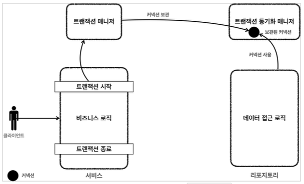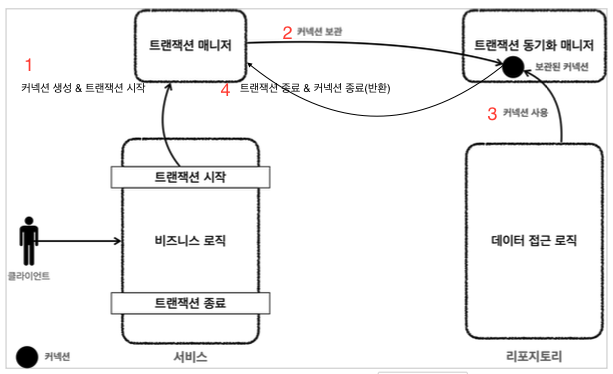 - 트랜잭션 매니저는 트랜잭션이 시작된 커넥션을 트랜잭션 동기화 매니저에 보관한다.