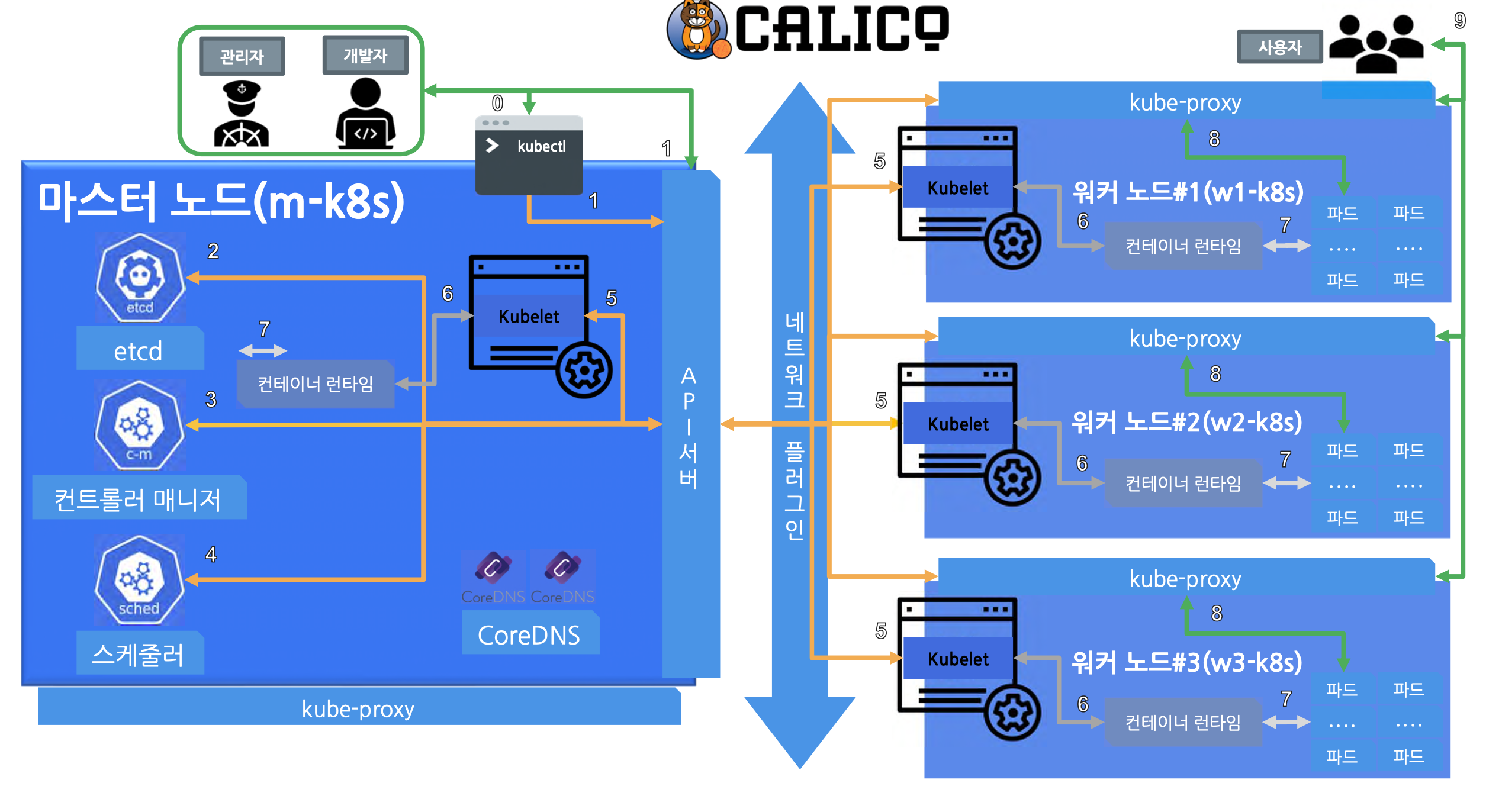 - 컨트롤 플레인 컴포넌트는 쿠버네티스 기능 제어를 전체적으로 담당하고, 노드 컴포넌트는 컨트롤 플레인 컴포넌트의 요청을 받아 각 노드에서 동작을 담당한다