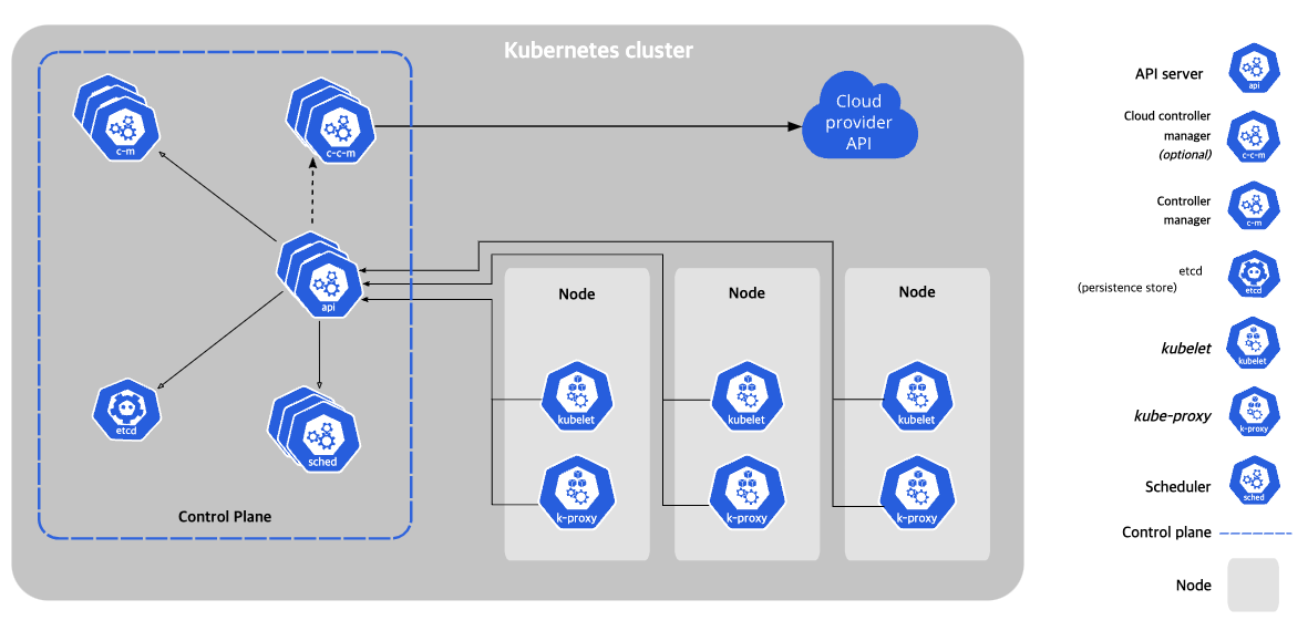- 컨트롤 플레인은 컨트롤 플레인 컴포넌트로 구성, 노드는 노드 컴포넌트로 구성