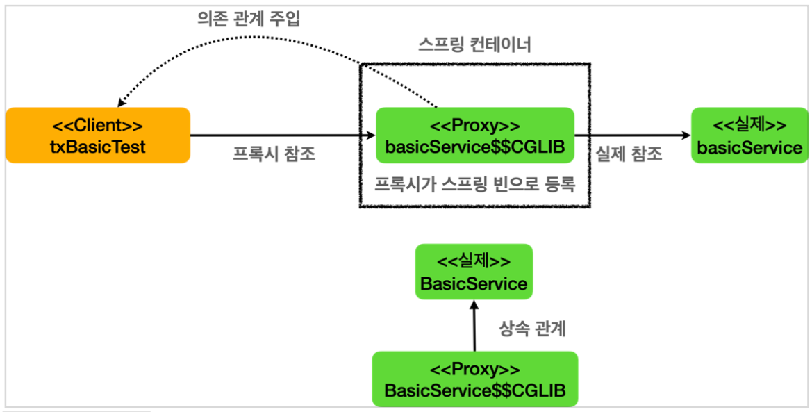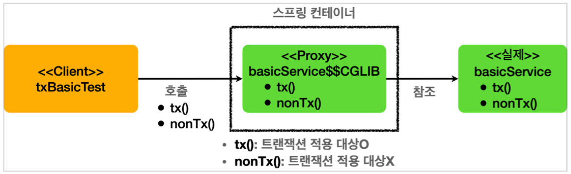 - @Transactional 애노테이션이 특정 클래스나 메서드에 하나라도 있으면 트랜잭션 AOP는 프록시를 만들어서 실제 객체(위 그림에서는 BasicService) 대신 컨테이너에 빈으로 등록한다