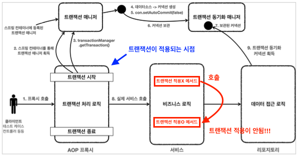 - 이러한 내부 호출은 프록시를 거치지 않기 때문에 트랜잭션을 적용할 수 없다