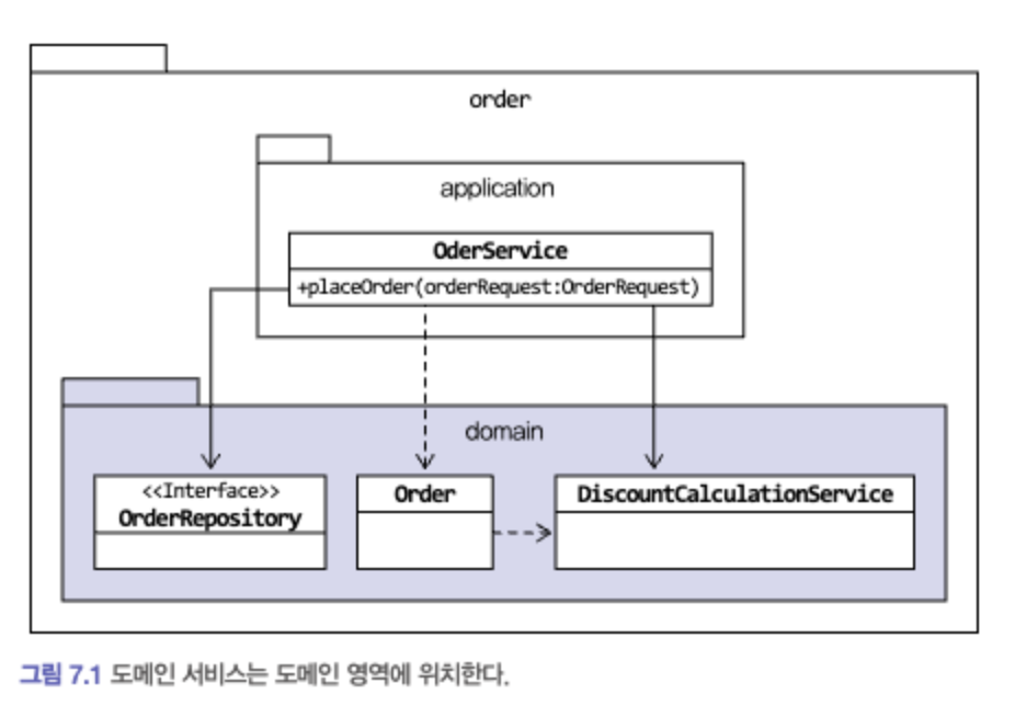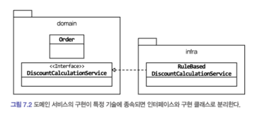 - [그림 7.2]와 같이 도메인 서비스의 구현이 특정 구현 기술에 의존하거나 외부 시스템의 API를 실행한다면 도메인 영역의 도메인 서비스는 인터페이스로 추상화해야 한다