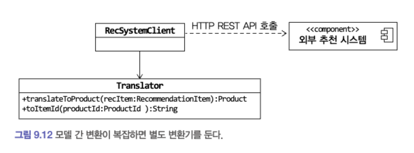 - 위 그림에서 RecSystemClient는 외부 시스템과의 연동을 처리하면서 외부 시스템의 도메인 모델이 내 도메인 모델을 침범하지 않도록 막아주는 역할을 한다