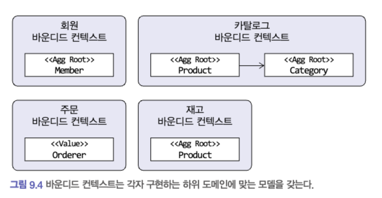 - 바운디드 컨텍스트는 도메인 모델을 구분하는 경계가 되므로 바운디드 컨텍스트는 구현하는 하위 도메인에 알맞은 모델을 포함한다
