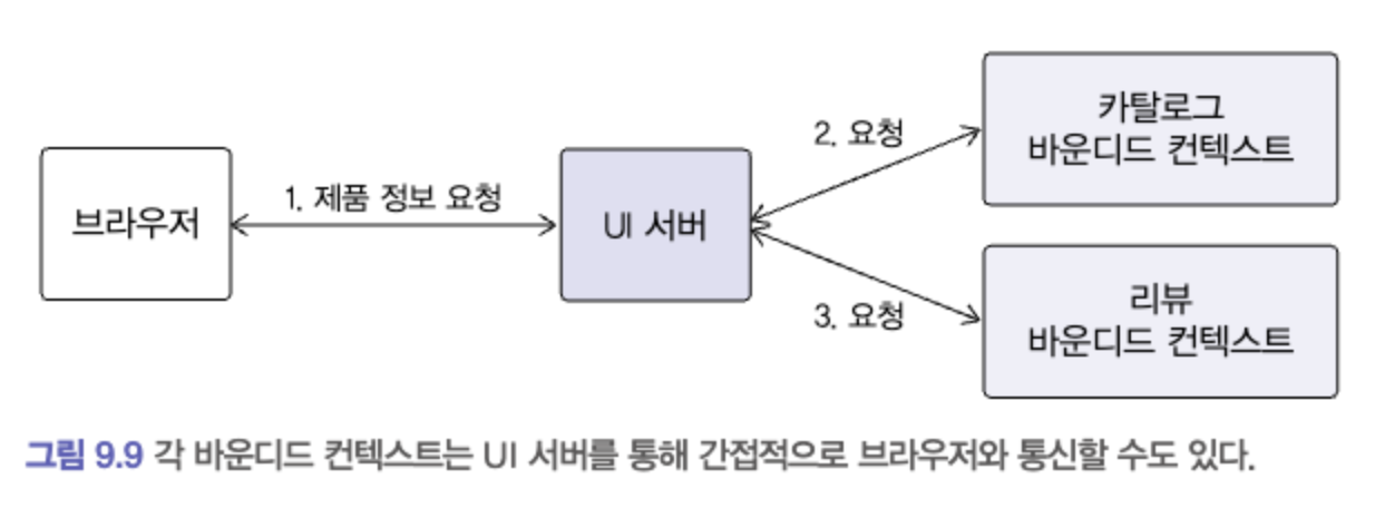 - UI를 처리하는 서버를 두고 UI 서버에서 바운디드 컨텍스트와 통신해서 사용자 요청을 처리하는 방법도 있다 (그림(9.9] 참고)