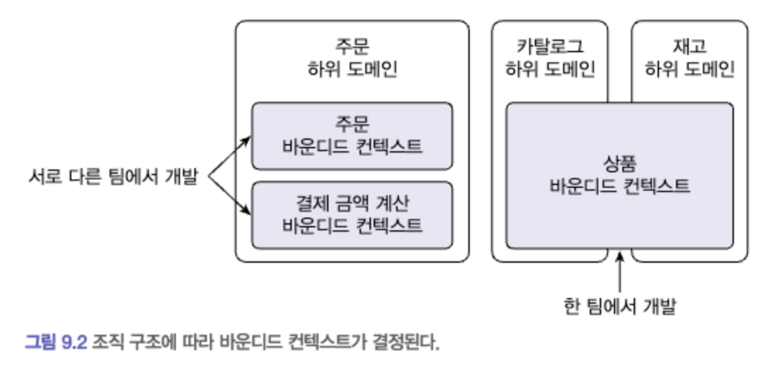 - 하위 도메인과 바운디드 컨텍스트과 일대일 관계를 맺는 것이 이상적이지만, 실제론 여러 제약에 의해 그렇게 구현하지 못하는 일이 빈번하다