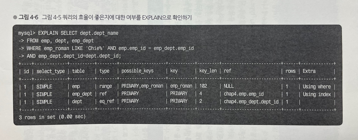 - 그림 4-6은 MySQL에서 EXPLAIN 사용 예를 나타낸 것이다