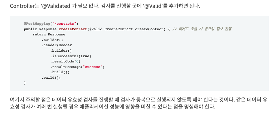 이 문제와 별개로 아래 글을 보고 컨트롤러에 @Validated가 없어도 된다고 생각해서 처음엔 붙이지 않았는데, 그렇게 하니 Validation이 적용되지 않았다(글 자체는 너무 좋은 글이다). 따라서 RequestParam이나 PathVariable에 Bean Validation을 적용할 땐 @Validated를 꼭 붙여주자. 참고로 ConstraintValidator를 사용할 때도 붙여줘야 한다. 사실상 특별한 이유가 없으면 꼭 붙여주도록 하자.