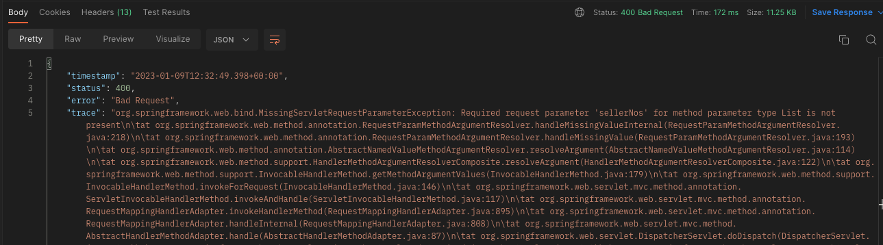 이와 별개로 모니터링 툴에 에러가 급증한 원인은 MissingServletRequestParmeterException이 500에러로 떨어졌기 때문이다. 스프링은 해당 예외에 대해서 기본적으로 400(Bad Request) 에러를 떨구지만, 현재 내가 진행중인 프로젝트 구조에선 익셉션 핸들러가 여러 개 정의되어 있어 직접 지정한 특정 예외에 대해서만 4XX 에러를 반환하는 형태를 취하고 있으며 500에러는 모두 모니터링 툴에 노출되는 상황이다.