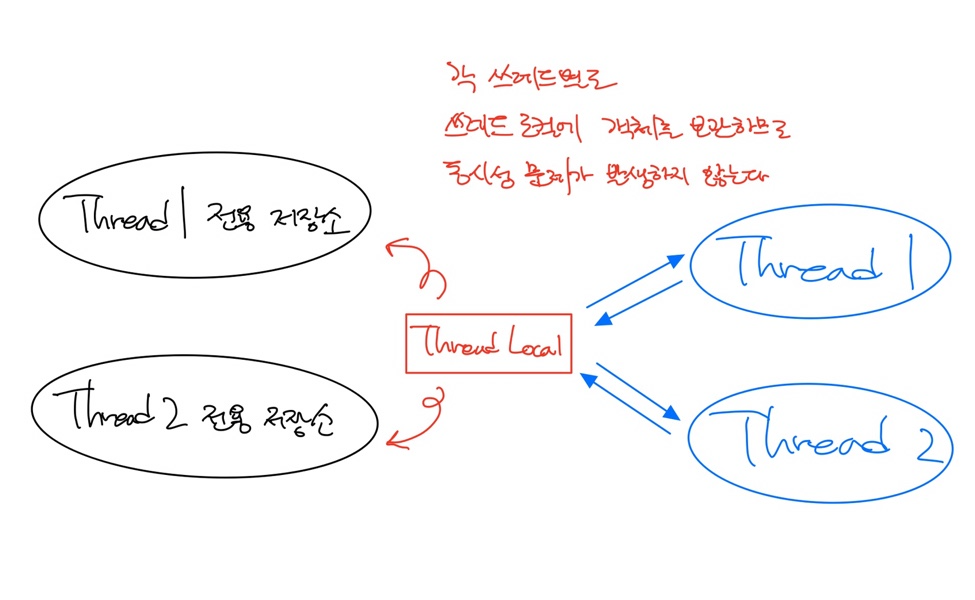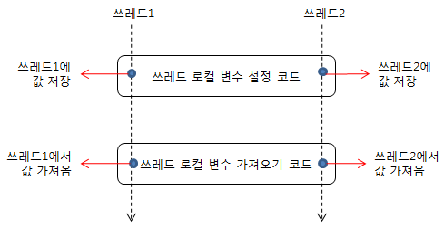 그러나 쓰레드을 이용하면 특정 쓰레드가 실행하는 모든 코드에서 쓰레드 로컬에 접근하여 해당 변수 값을 사용할 수 있게 된다. 즉, 변수의 라이클 사이클이 쓰레드와 같아지는 것이다(삭제하지 않는다는 가정하에). 아래는 쓰레드 로컬의 동작방식과 간단한 사용법이다.