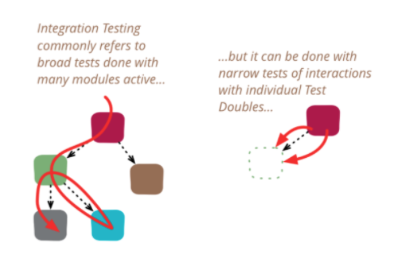 - 좁은 의미: 각각의 요소들만 잘 동작하는 지를 검증하는 것 (=서로 다른 모듈 간의 통합이 잘 이루어지는지 검증)