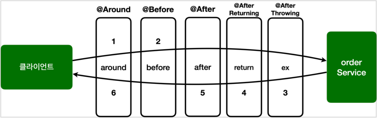 - @Around, @Before, @After, @AfterReturning, @AfterThrowing 순이다