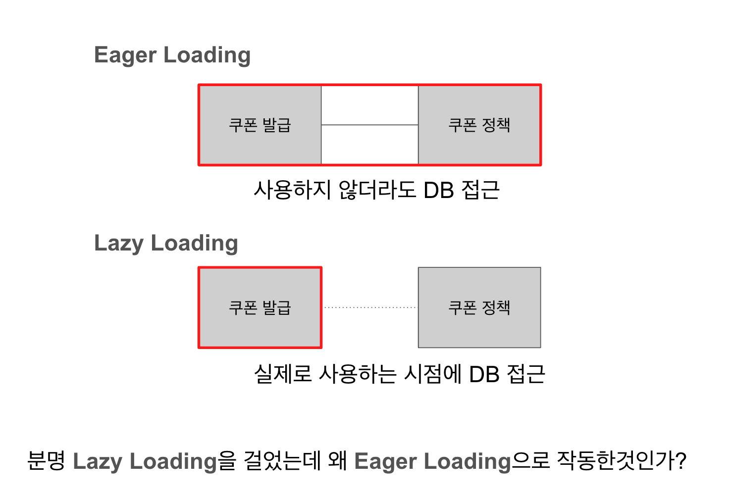 데이터 뻥튀기가 되는 문제는 원인이 분명했지만, N+1 문제는 의아했다. 분명 Lazy Loading을 걸어놨는데, 왠지 모르게 Eager Loading이 발생했다. 물론 Lazy Loading을 건다고 해서 N+1 문제가 모두 해결되는 것은 아니지만, 적어도 쿠폰 정책을 참조하지 않는 경우엔 N+1이 발생하지 않았어야 했다.