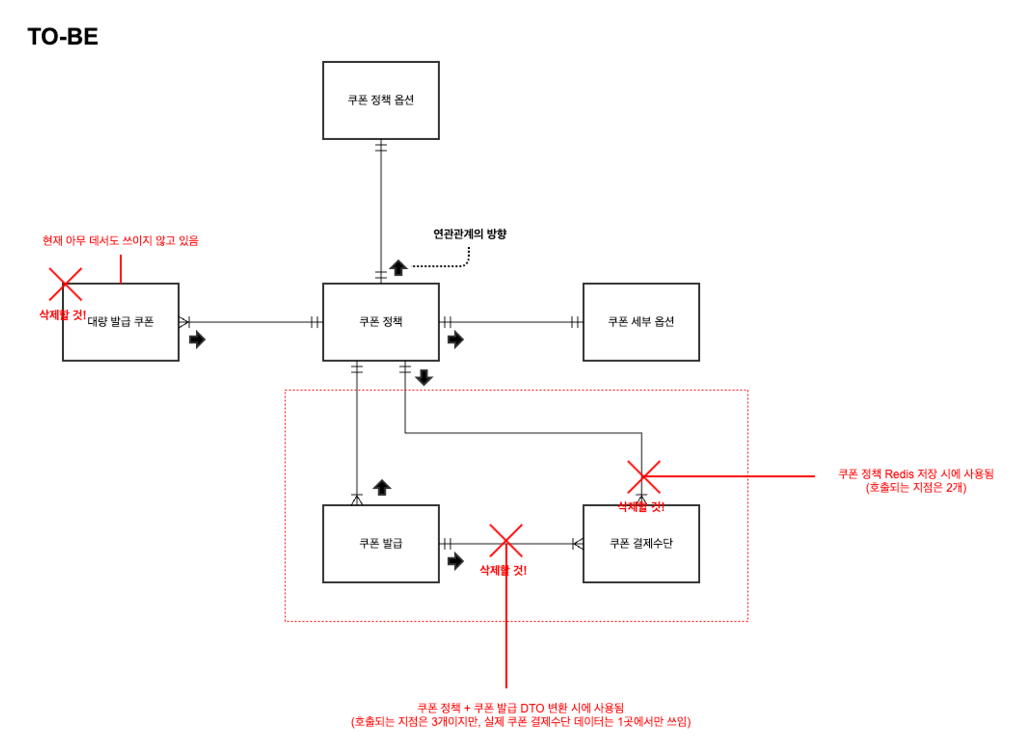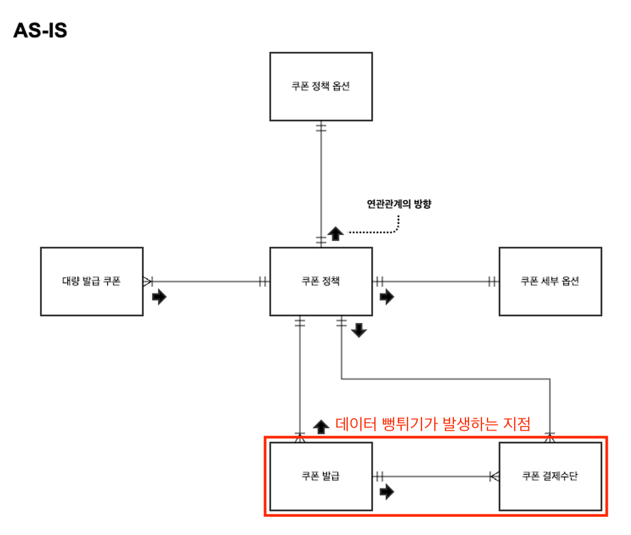 근본적인 문제의 해결을 위해서 쿠폰 도메인을 이루고 있는 JPA Entity의 연관 관계가 무분별하게 사용된 것을 제거하고, 적절히 DTO 조회를 수행하고자 했다. 다음은 기존 JPA Entity의 관계를 간략하게 표현한 것이다.