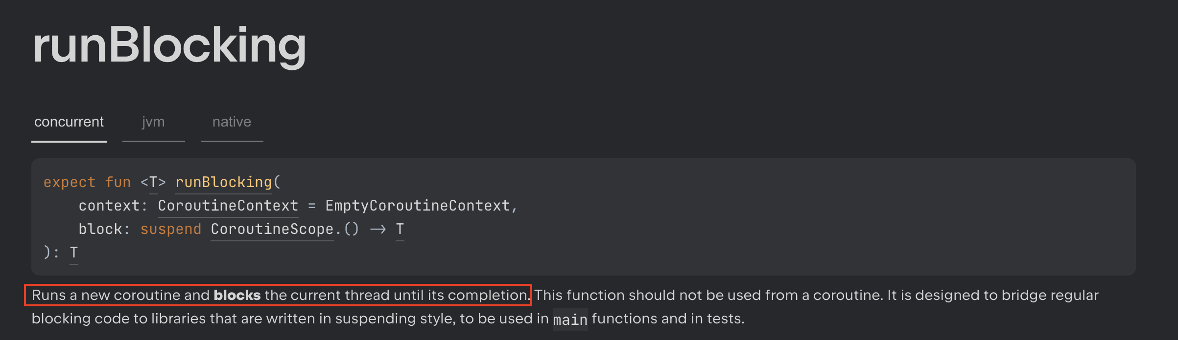 runBlocking은 코루틴 빌더의 하나로서, 내부의 코루틴 연산이 끝날 때까지 메인 쓰레드를 blocking시키는 함수이다.