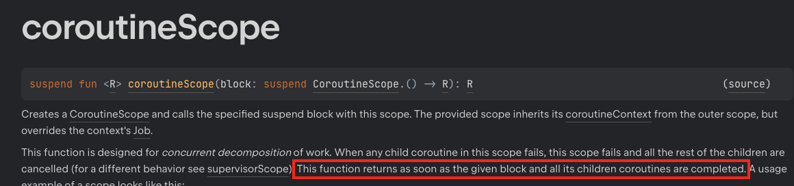 이 문제는 coroutineScope 함수의 잘못된 이해에서 비롯됐다. coroutineScope 함수는 블럭 내의 코루틴이 모두 완료될 때까지 기다린다. 코루틴은 경량화된 스레드라고 간단하게 생각하면 된다. 하나의 프로세스 안에 여러 스레드가 존재할 수 있듯이, 하나의 스레드 안에 여러 코루틴이 존재하여 작업을 수행할 수 있다. 자세한 내용은 공식문서를 참고하자.
