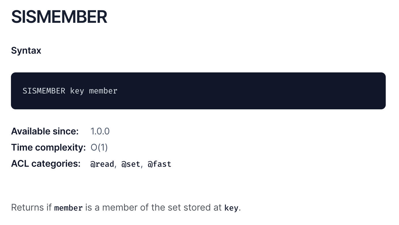 - Set 타입에서 사용되는 연산으로, 특정 값이 Set 안에 존재하는지 여부를 반환한다