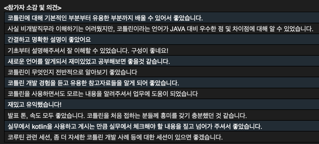 아쉬움을 뒤로 한 채 세션을 마치고 나니 굉장히 후련했다. 동시에 안 좋은 피드백에 대한 두려움도 생겼다. 그런데 의외로 많은 분들이 좋게 말씀해주셨고, 다음에 코루틴 강의도 해달라는 말씀을 주셔서 굉장히 뿌듯했다(물론 코루틴 강의는 하고 싶어도 너무 어려워서 하려면 한참 뒤에나 할 수 있을 것이다..). 반대로 함께 업무를 하는 팀원께서는 내용 구성의 측면이나 말하는 속도에서 조금은 아쉬웠다는 의견도 주셨다. 이런 피드백들 하나하나가 정말 큰 도움이 되었다.