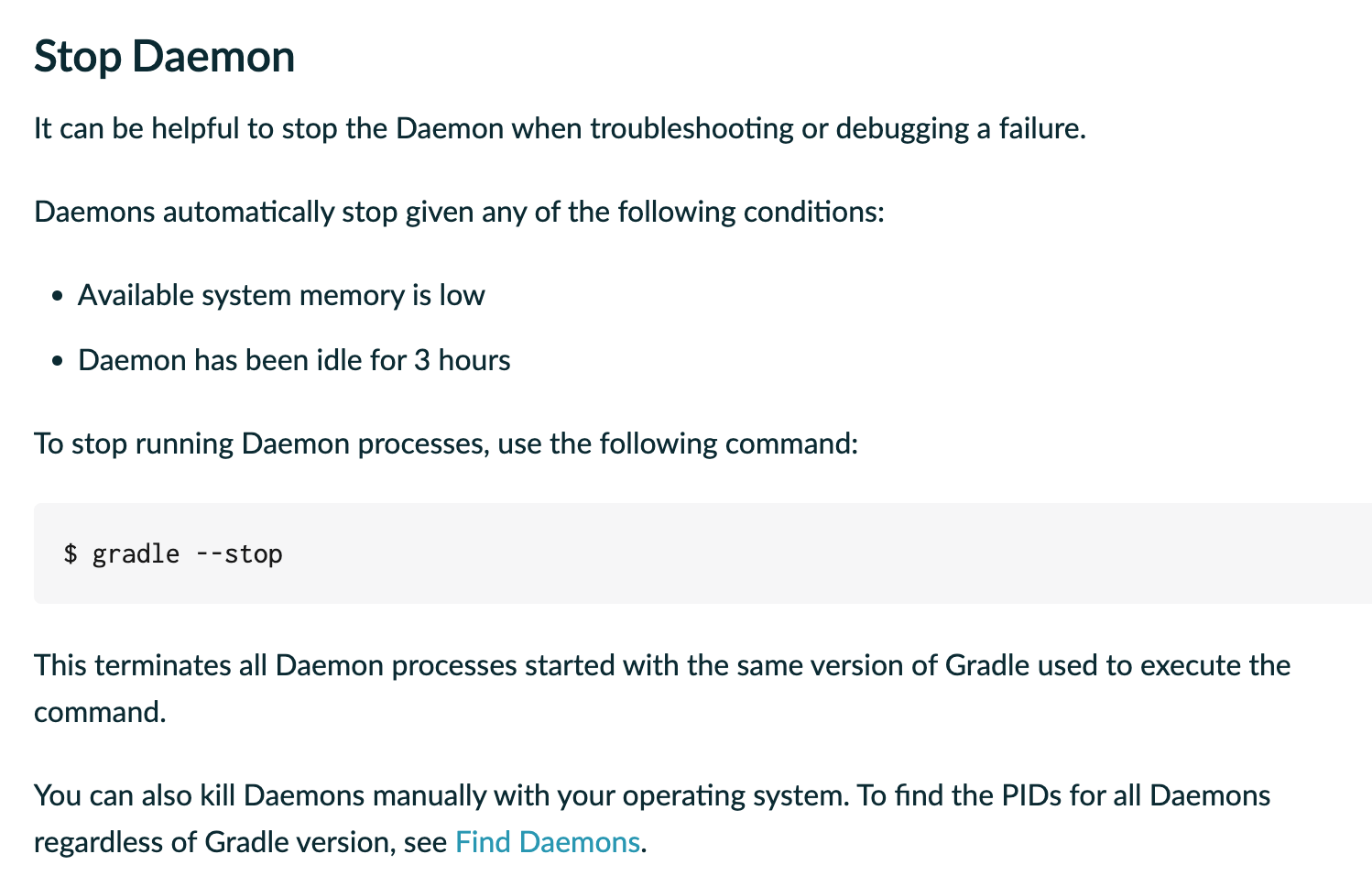 참고로 gradle 대몬의 유휴 상태는 최대 3시간까지 유지될 수 있다고 한다. 공식문서에서는 대몬 프로세스를 멈추기 위해 gradle --stop 명령을 사용하라고 했는데, 내가 해봤을 땐 대몬 프로세스가 멈춰지지 않아서 그냥 죽이는 방법을 선택했다.