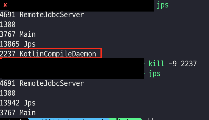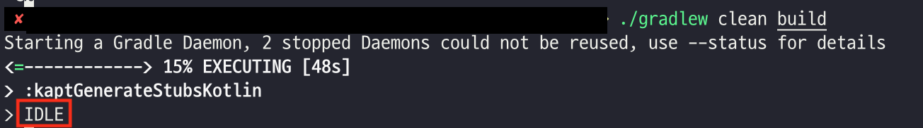 뭔가 gradle 프로세스가 유휴상태에 빠진 것으로 보여서 공식 문서에 "gradle IDLE"이라고 검색해본 결과, gradle 대몬 프로세스가 문제인 것을 파악할 수 있었다. jps 명령어를 통해 대몬 프로세스의 PID를 찾아내고, kill -9 PID 명령어를 통해 프로세스를 제거했다.
