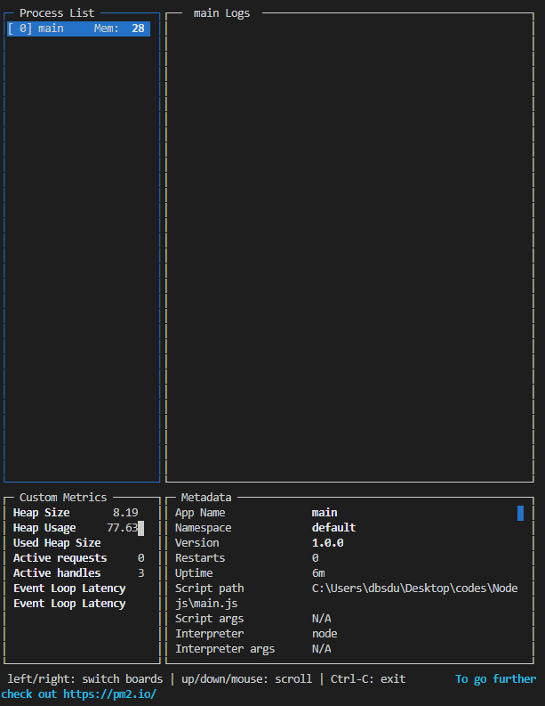 - --name옵션을 통해 해당 프로세스에 앱 이름을 지정하여 관리할 수 있다. 지정하지 않는다면 기본적인 파일명이 지정된다(main.js -> main).