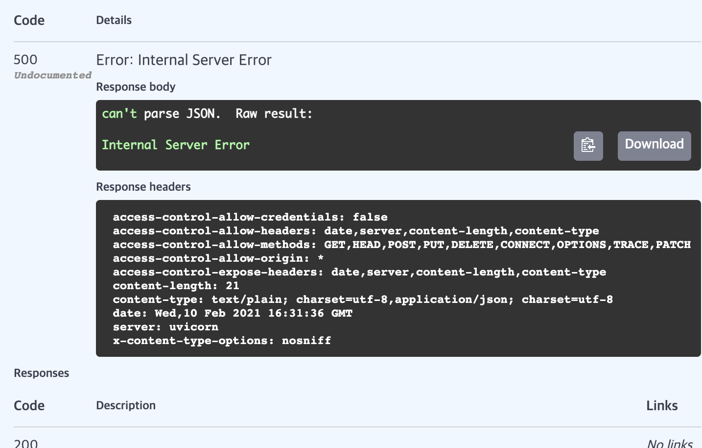 GET 방식으로 쿼리를 보내면 다음과 같은 Response body와 함께 Status Code 500이 반환됐다.