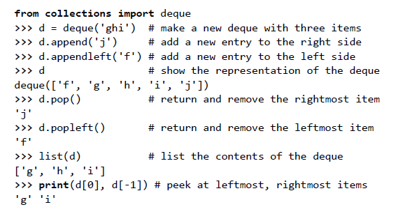 - 파이썬에선 collections라는 모듈에 deque란 클래스로 덱이 이미 구현되어 있다.