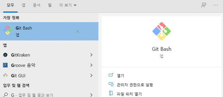 정상적으로 Git이 설치가 됐다면 검색창 - Git Bash에 들어가서 다음과 같은 명령어를 통해 설치된 Git의 버전을 확인할 수 있다.