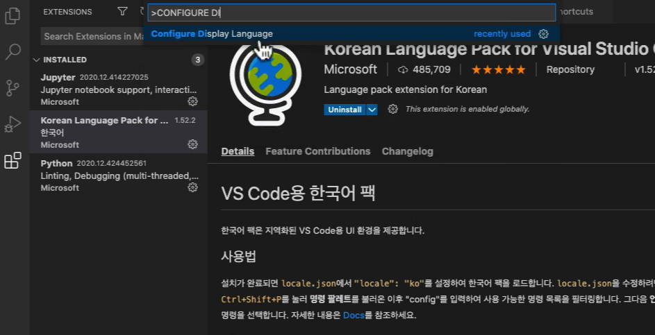 VSCode는 한국어를 지원한다. 한국어 팩을 설치한 후 Ctrl+Shift+P를 눌러 명령 팔레트를 띄운 후, configure display language에서 "ko"를 선택하면 한국어 패치가 완료된다.