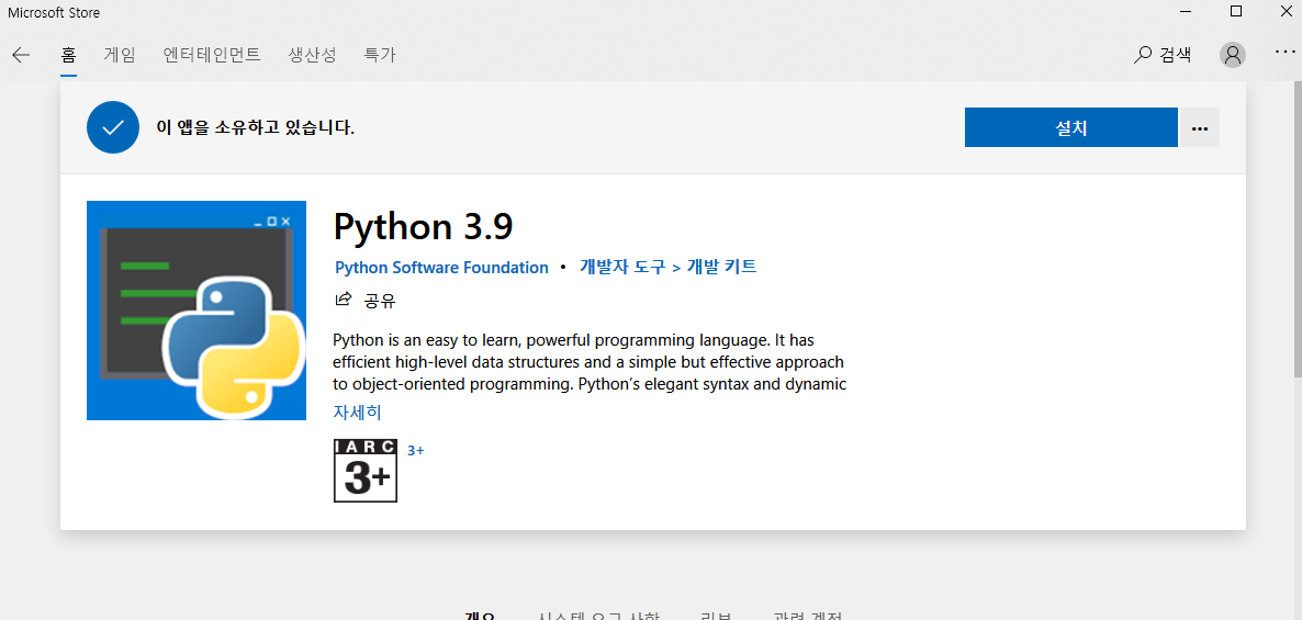 검색창 - Microsoft Store에서 Python3.9를 설치한다.