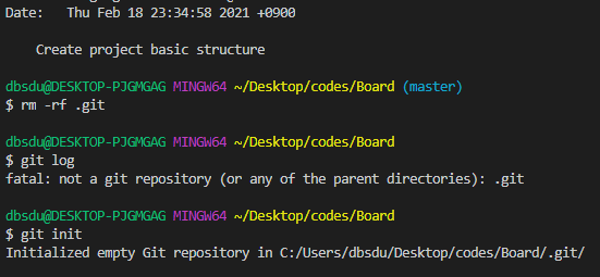 .git 폴더를 완전히 삭제하고 히스토리를 초기화하기 위해선 다음 명령어를 입력한다.