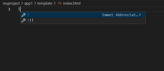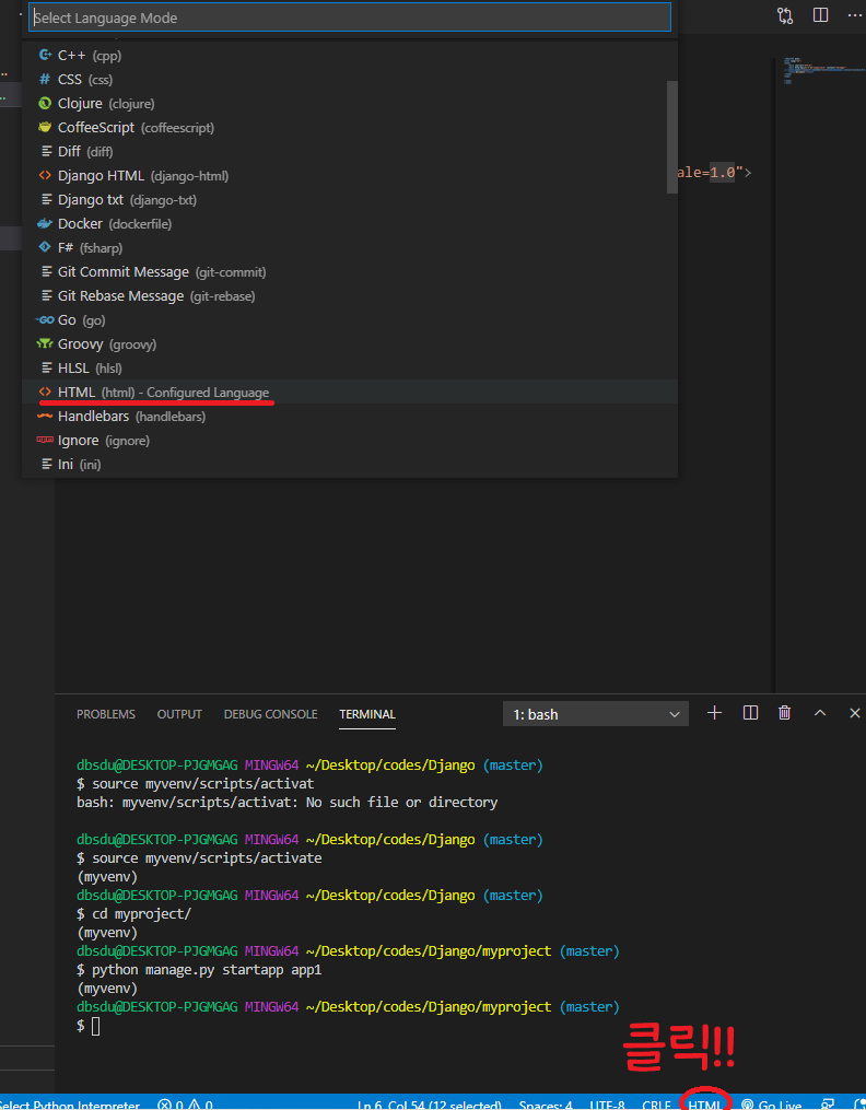 만약 자동완성이 되지 않는다면 우측 하단의 언어 세팅이 Djnago HTML로 되어 있을 것이다.