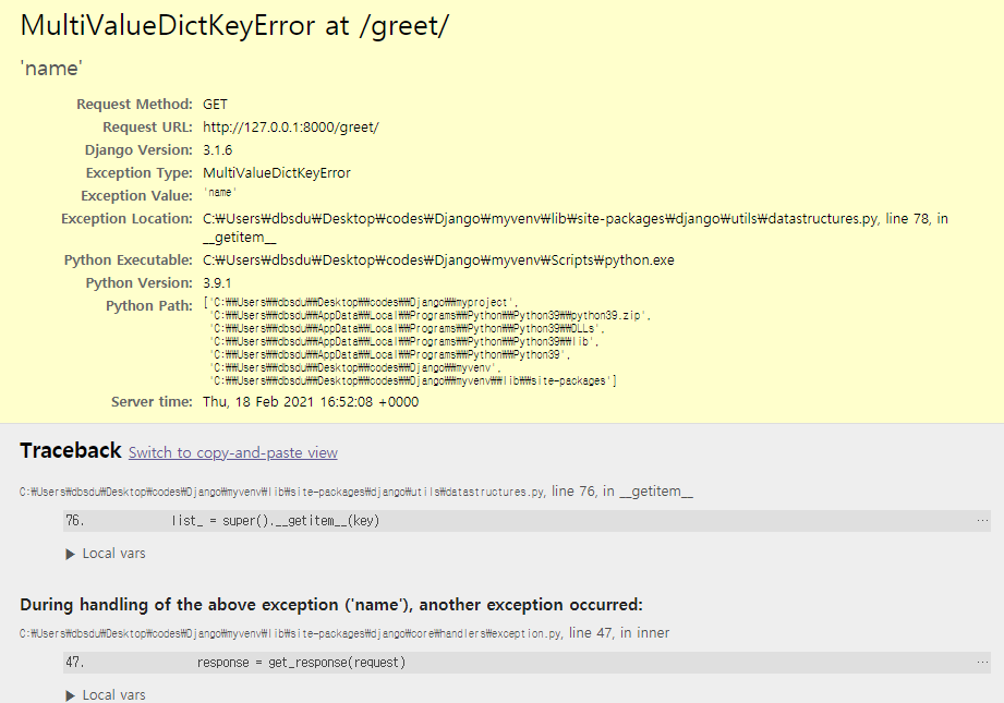 만약 MultiValueDictKeyError가 발생했다면 templates/index.html의 input태그에서 오타가 났을 확률이 높다. MultiValueDictKeyError는 대체로 쿼리스트링에서 발생하는 문제이기 때문이다.