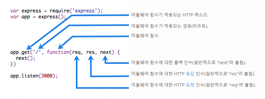 미들웨어 안에서는 기본적으로 요청 객체인 req와 응답 객체인 res를 파라미터로 전달받아 사용할 수 있다. 그리고 이 미들웨어 함수를 호출한 app 객체 또한 참조할 수 있도록 req의 속성으로 app 객체가 들어있다. 즉, req.app과 같은 형태로 app 객체를 참조하여 사용할 수 있다.