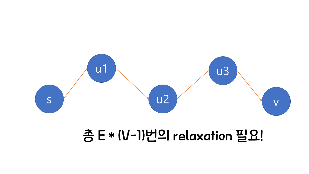 노드가 V개 존재하면 최단 경로는 최대 V-1개 존재할 수 있으며, 매 라운드마다 모든 엣지에 대해서 relaxtion이 일어나는 과정에서 순차적으로 각 노드간의 최단 경로가 도출되기 때문이다. → E * (V-1)